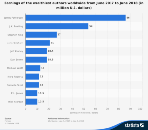 It’s funny how people equate the word “author” with “rich” but in reality, this just isn’t true. Most authors work other full-time or part-time jobs and cannot live solely off of their book earnings. In fact, according to statista.com, 66% of emerging authors work a day job (which seems a little low if you ask me). According to this same source, 20% of authors who make over $100k with their books still work a day job.